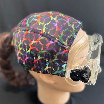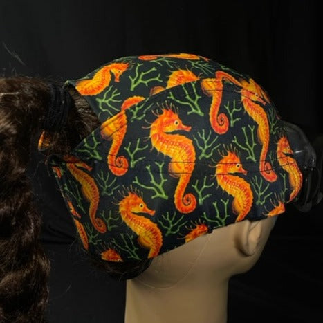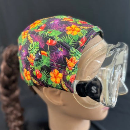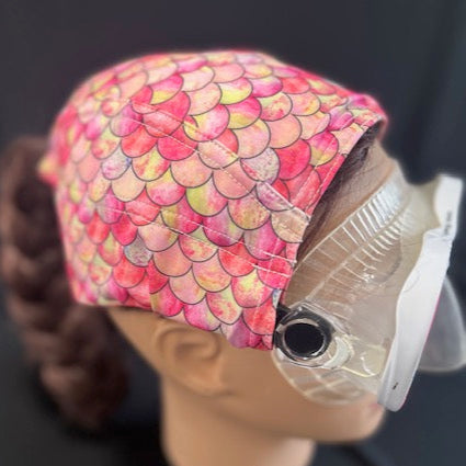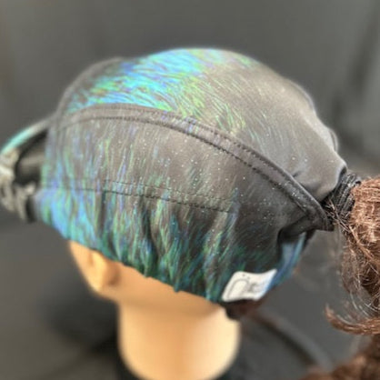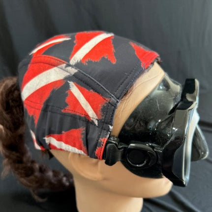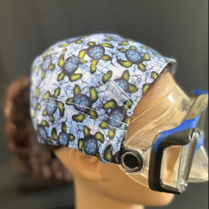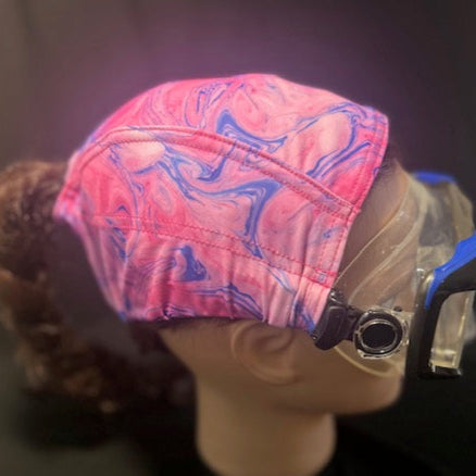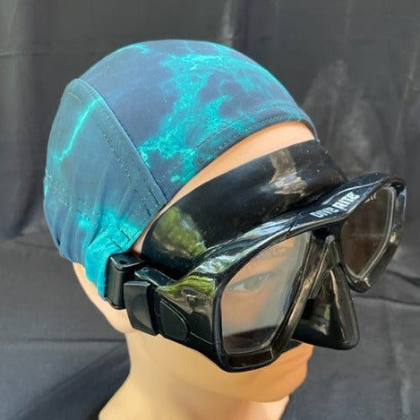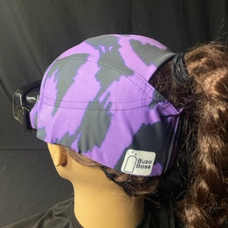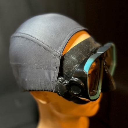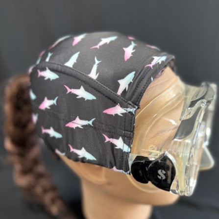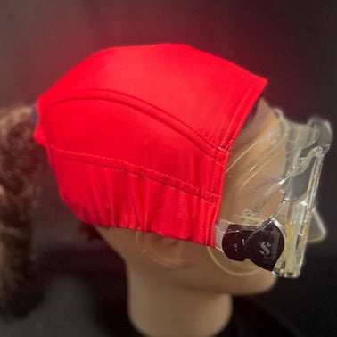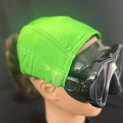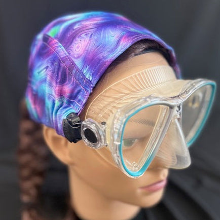 A cap that slips right on to your mask strap! The patented design gives a thin layer of protection to your head, without being bulky or restrictive. Works to hold bangs back and hair from slipping out of a ponytail and in to your mask or vision. Wear your ponytail or braid low, or high through the opening in the back. Keeps mask straps tucked away neatly, and protects your strap clasps from popping open. 82% polyester/18% spandex, 4-way stretch material provides for a one-size fits most, and will hold it's stretch well in the water. 50+ SPF. Looking for less coverage, but something light to hold your hair in place? Take a look at our BuzoBands!